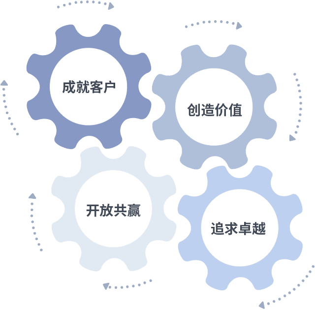 成就客户是一切决策的出发点,,,,创造价值是衡量所有工作的标准,,追求卓越是我们做事做人的态度,,,,开放共赢是我们的格局也是最终的结果。。。。价值观的齿轮环环相扣,,,推动着组织里的每个人不断向前。。。。