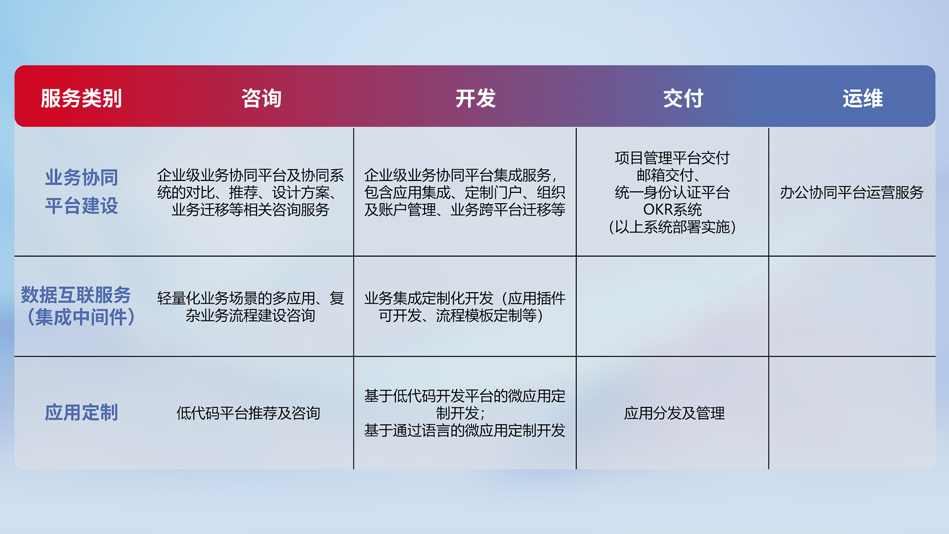 针对钉钉、、、、企微、、、、IDaas等平台级产品提供产品的规划、、、方案、、、交付、、、、定制化开发等服务,,,实现如统一协同办公、、智能客户服务、、、混合会议管理、、、、智能数据查询、、、等业务场景,,实现数字化转型。。。。